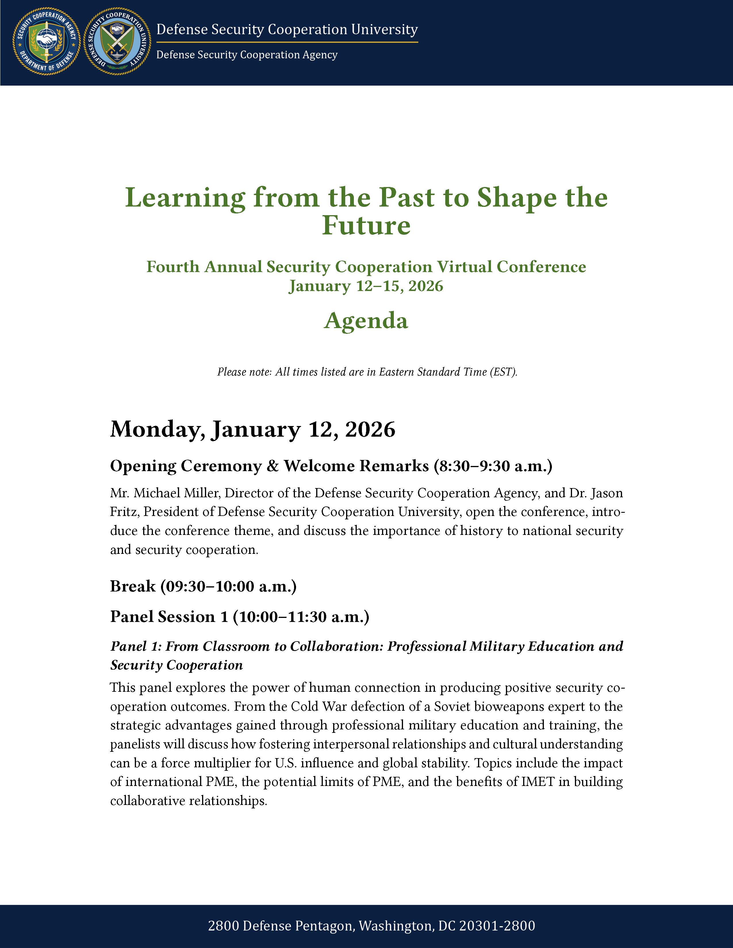 Please note that this virtual conference will take place in Eastern Standard Time (EST). Event links will be shared with approved attendees closer to the conference dates. Additionally, registration for the Fourth Annual Security Cooperation Conference is now closed. For more information, please contact dsca.ncr.dscu.mbx.conference@mail.mil.