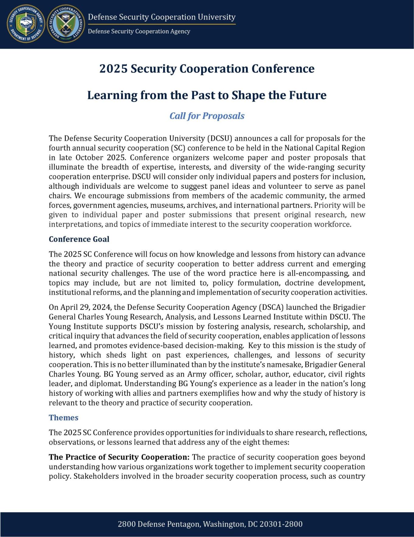 The Defense Security Cooperation University (DSCU) is pleased to invite submissions to the 2025 Security Cooperation Conference, which will be held in Fall 2025 in the National Capital Region. The theme of the 2025 conference is “Learning from the Past to Shape the Future.”