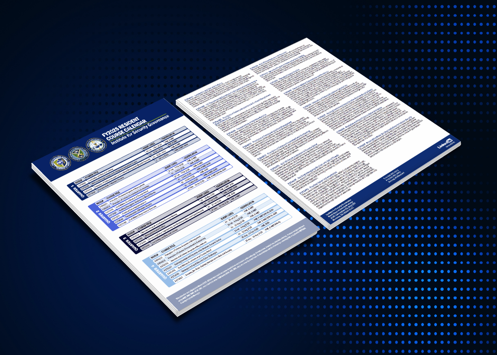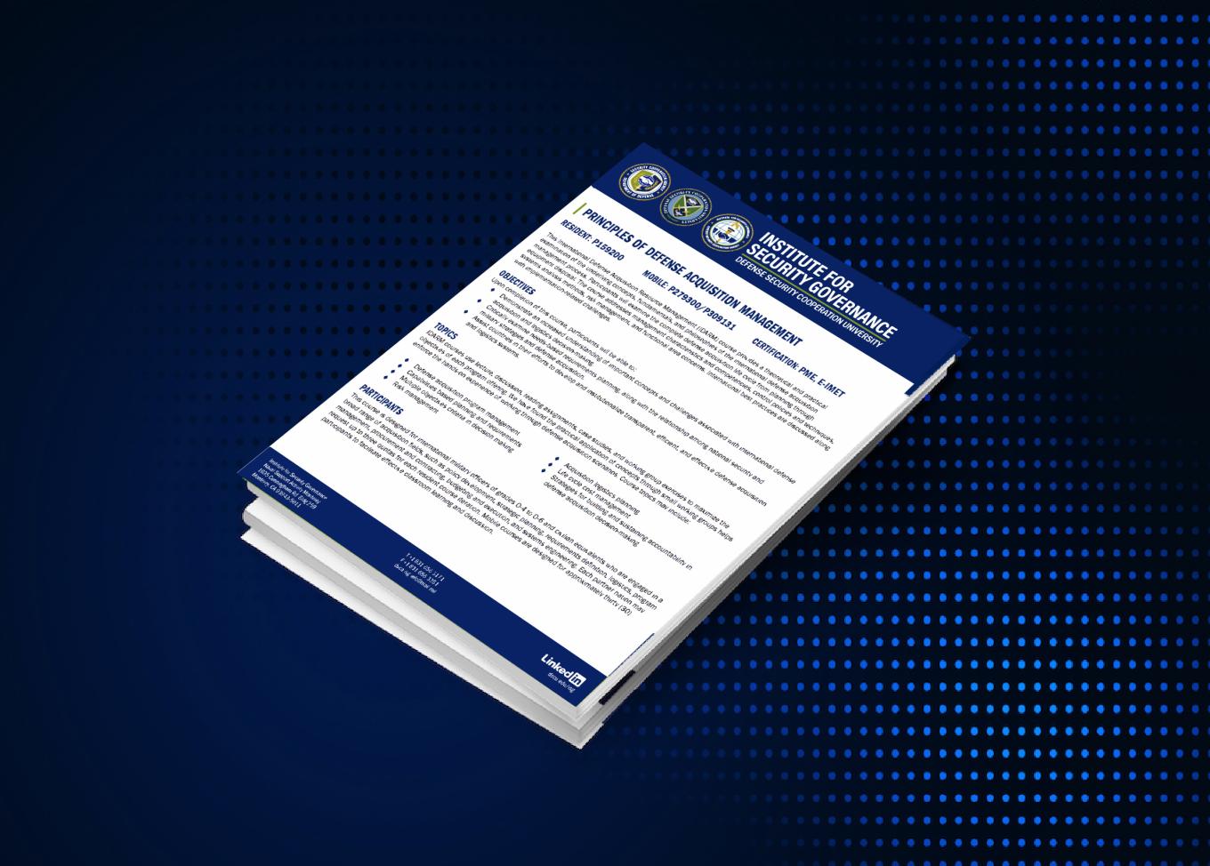 This Course Catalog outlines the Institute’s varied course curricula, organized in the following education portfolios: Security Governance & Civil-Military Relations; Cyber Capability; Emergency Management & Resilience; International Defense Acquisition Resource Management, Logistics Capability Building; Maritime Security; and Peacekeeping, Conflict & Terrorism.