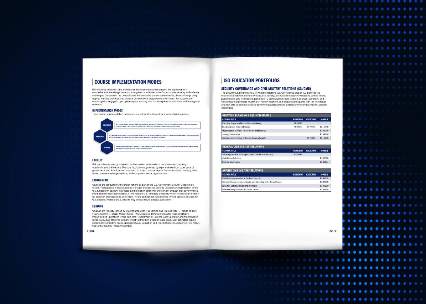 ISG’s Resident and Mobile Education provides military and civilian officials with unique education and professional development programs that support Security Cooperation and Institutional Capacity Building (ICB). ISG's tailored education and professional development courses help build a comprehensive knowledge base and strengthen partner capacities to confront complex security and defense challenges. Courses are designed to cultivate individual understanding of complex issues; foster peer-to-peer learning; and build international communities of practice. In the Schoolhouse information Hub, you will find descriptions of ISG Educational Portfolios and course descriptions related to each Portfolio. All items featured on this page are downloadable, printable, and shareable. Please check back frequently, as schedules and course listings may change.